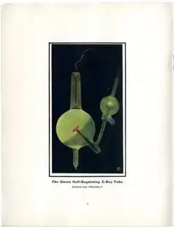X-rays are generated when high energy electrons are stopped by a hard target. In the earliest tubes, the electrons were generated by the collision of positive ions with the cathode. To produce the ions, a low pressure gas had to be maintained inside the tube. Unfortunately, as this type of tube is used, the low pressure gas is gradually depleted causing the tube current and therefore the x-ray output to fall. The operator could compensate for this by increasing the voltage on the tube, but this would produce "harder" or more penetrating x-rays. In many cases this degraded the image quality. One early solution was to introduce a small amount of gas back into the tube. Unfortunately this procedure was difficult to control and it only provided a temporary solution. Saÿen's design solved this problem by a clever strategy that ensured a constant gas pressure in the tube. As the gas in the main part of the Saÿen tube (see photo) is depleted, the electrical resistance in the tube would increase causing the current to take a lower resistance path: a spark through the air gap to the wire leading to the smaller bulb. That current would heat the material in the small bulb and cause it to release gas back into the main tube. Once the gas pressure rose in the main tube, its electrical resistance would drop back into normal operating range. The gas pressure in the tube could be adjusted by controlling the size of the air gap: a larger gap meant that the tube would operate at a higher voltage with harder (higher energy, more penetrating) x-rays. Saÿen used potash (potassium hydroxide, KOH) in the side bulb but other chemicals that would outgas when heated were also used.[6] James W. Queen & Company manufactured and sold the "Queen Self Regulating X-Ray Tube" for several years.
