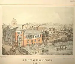 The company was established in rented premises in 1868 and comprised a tobacco shop. Nielsen was after a while able to buy the building as well as the one next door. A new tobacco factory was constructed at the site in 1887. The two-storey building was 37 alen long and 23 alen wide. The factory closed in the first half of the 20th century when the number of tobacco factories in Odense declined from 10 to 2.[1]