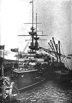 Majestic was laid down at the Portsmouth Dockyard in February 1894. She was launched on 31 January 1895, after which fitting-out work commenced. She was commissioned into the Royal Navy less than a year later, in December 1895, serving with the Channel Squadron at the Portsmouth division. She was present at the Fleet Review at Spithead for the Diamond Jubilee of Queen Victoria on 26 June 1897,[3] and was later flagship to Vice-Admiral Sir Harry Rawson, Commander-in-Chief of the Channel Fleet. Captain George Egerton was appointed in command on 28 June 1899,[4] and paid off in April 1901, when Captain Edward Eden Bradford was appointed in command as she became the flagship of Rear-Admiral Arthur Wilson, who had been appointed Commander-in-Chief of the Channel Squadron.[5] She took part in the Coronation Review held at Spithead for King Edward VII on 16 August 1902,[6] and in September that year was head of a squadron visiting Nauplia and Souda Bay at Crete in the Mediterranean Sea.[7] She underwent a refit at Portsmouth from February to July 1904, and then became a unit of the Atlantic Fleet when a reorganisation resulted in the Channel Fleet becoming the Atlantic Fleet in January 1905. On 1 October 1906, she paid off into reserve at Portsmouth.[3]