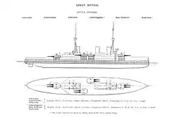 Starboard elevation and deck plan as depicted in Brassey's Naval Annual, 1915. Note: plan is of Invincible-class battlecruisers; the Indefatigable-class had a third superstructure element with 'P' & 'Q' turrets more widely spaced.