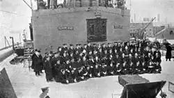 In 1912 it was agreed that the ship would visit its donor country as a 'thank you' for funding its construction, with a basic nine month long itinerary developed in the last months of 1912.[47] To facilitate the flag-waving cruise New Zealand was temporary detached from the 1st Battlecruiser Squadron on 20 January 1913 for the duration of the voyage with Halsey having independent command.[44] The initial date of departure progressively moved backward into 1913 with the ship finally departing the Royal Navy dockyard at Devonport on 28 January for Portsmouth which it reached two days later. On 3 February, 300 expatriate New Zealanders organized by Sir Thomas Mackenzie (New Zealand's High Commissioner to the United Kingdom) visited the ship at which he unveiled the battlecruiser's coat of arms (which had been gifted by the country's expatriate community in the United Kingdom).[47] This was followed by a visit by King George V accompanied by Winston Churchill and James Allen (New Zealand's Minister of Finance and Defence) and other high–ranking officials on 5 February 1913.[48]