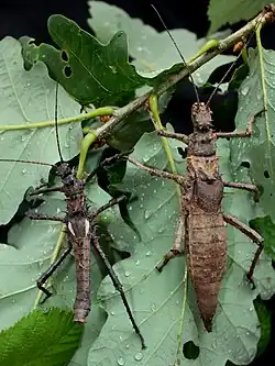 Both sexes, like all species of this genus, have many pointed spines on their bodies and legs. The shortened tegmina has developed front wings completely cover the just as shortened hind wings. Females are dark brown in color and very compact in shape. The abdomen of egg-laying specimens in particular bulge in shape. The abdomen ends in a spike-like secondary ovipositor. Characteristic is a triangular or oval area in front of the wings, which is white to beige in the otherwise black-brown female nymph and only light brown to beige in the adult, then-brown females. In contrast to the top, the bottom is very vividly drawn. Female nymphs in particular have bright orange areas on the undersides of the femura, the meso- and metathorax, the intermediate membranes of the abdominal segments and other smaller orange areas on the sternites of the abdomen itself. Females are larger than males, being 90 to 110 millimetres (3.5 to 4.3 in) long. The males are much slimmer, very prickly and only about 65 to 75 millimetres (2.6 to 3.0 in) long. They are mostly dark brown in color and thus more closely resemble the nymphs in their coloration. With them, the front edge of the tegmina is often drawn lightly, which results in two short, light lines at the lateral edge of the wings.[2][3]