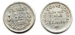 The name (Itzincab Cámara) is a combination of Maya and Spanish terms. Itzincab is a word from the Mayan language meaning brother of the earth and Cámara was the Spanish surname of one of the former owners, but the word "cámara" means chamber. Various spellings have been used in relation to the hacienda. On coins from 1888 the spelling was Yɔincab. In 1910 the name changed from Isincab to Idzincab; in 1960, it was Idzincab Cámara; in 1970, the name became Itzincab Cámara; in 1980, it was changed to Idzincab Cámara, in 1995 the name became Itzincab; and today the property is called Itzincab Cámara.[3][4]