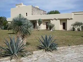 The oldest property information related to Hacienda San Pedro date from 1666, it was owned by several Spanish families, its history is bound to Valle de las Salinas (Salinas Valley) colonization in the former New Kingdom of León. The founder and first owner of this hacienda was Captain Alonso de Treviño. In 1814 it was transferred to the Gutiérrez de Lara family, at the time it comprised a huge extension of the Valle de las Salinas. Its construction lasted 31 years, and was finally finished by 1845. The farmstead central place also was used as a fort; in it General Mariano Arista and his troops spent the night after having a combant against 600 comanches on January 23; 1840, besides this event, the site was used as fortress during many those Indian raids during the Comanche War.[1][2]