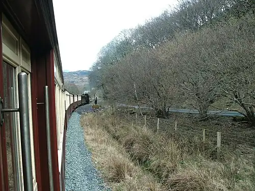 Hafod y Llyn closed on 26 May 2010, when the next section of line to Pont Croesor opened.[4] From January to March, 2011, trains ran to Hafod y Llyn from Porthmadog as part of the Winter Warmer services.[5][6] This replaced the similar service on the Ffestiniog line to Trwyn-y-garnedd, which was suspended due to the bypass construction work at Minffordd. It is still occasionally used such as in March 2017 when it appeared in the timetable.