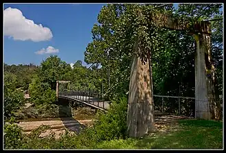 The Haggard Ford Swinging Bridge is a historic suspension bridge in Boone County, Arkansas. It is located adjacent to Cottonwood Road (which it once carried), about 8 miles (13 km) north of Harrison, and spans Bear Creek. It has cast-in-place concrete abutments, towers, and anchorages, and is supported by steel cables. A wooden deck, one travel lane in width, is suspended from steel hangers. The bridge is about 160 feet (49 m) long. The bridge was built 1938–41 with funding from the Works Progress Administration. Fill surrounding the abutments was washed away in 1945 and subsequently replaced. The bridge deck was replaced in 1977.[2]