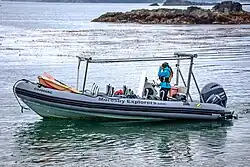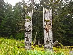 The Haida Gwaii Watchmen Program encourages young Haida to work alongside elders to protect and teach visitors about Gwaii Haanas National Park Reserve and Haida Heritage Site.[1] The program is co-managed by the Council of the Haida Nation and Parks Canada.[2] The Watchmen ensure that Haida cultural, historical, and natural tourism stays in the hands of the Haida people.[3] The program consists of 2-4 Watchmen who live and work as guardians, watching over each site in Gwaii Haanas.[4] Three human figure with traditional Haida hats represent the Haida Watchmen.[2]