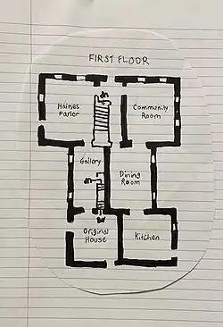 The first floor comprises 6 rooms and two sets of stairs. At the front of the home is the Haines Parlor which has been restored as a formal parlor of the 1870s. This room is filled with various antiques and restored, period accurate woodworking. Across from the Parlor is the Community Room. Formally known as the Evan and Suzanne Morris Community Room it was once the East Parlor. It is one of two rooms in the home with a fireplace. It is currently used for meetings and events.[3]