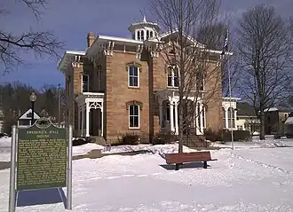 Frederick Hall was born in Vermont in 1816, and moved to Michigan in 1836. He came to Ionia in 1841 and began buying and selling timberland, eventually becoming probably the richest man in the county. He was appointed by President James K. Polk as the receiver of public money for the land office at Ionia in 1845. He was elected to serve in the state legislature in 1849, and was later a candidate for Congress and for Lieutenant Governor.[3] He became the first mayor of Ionia in 1873,[4] and was a director of the Ionia and Lansing Railroad and President of the First National Bank of Ionia.[3]