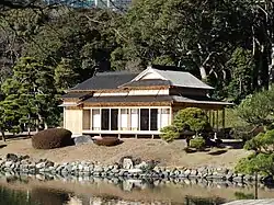 After the Meiji Restoration, the site was proclaimed the "Hama Palace" (浜離宮, Hama-rikyū) by Emperor Meiji, and continued to be used as a state guest house until the construction of the Rokumeikan. In 1879, Emperor Meiji received Crown Prince Frederick William of Germany at the Hama-rikyū. Later that year, former United States President Ulysses Grant stayed for a month at the Hama-rikyū during his extended visit to Japan.[2] The state guest house was demolished in 1889. The gardens burned during the 1923 Great Kantō earthquake and again in March 1945 during the Tokyo air raid. In November 1945, the Hama-rikyū was transferred from the Imperial Household Agency to Tokyo Metropolis and was opened as a public garden in April 1946. In 1952, it was designated as a Special National Historic Site and also as a Special National Place of Scenic Beauty.[3] Various teahouses have been reconstructed in the 2010s.
