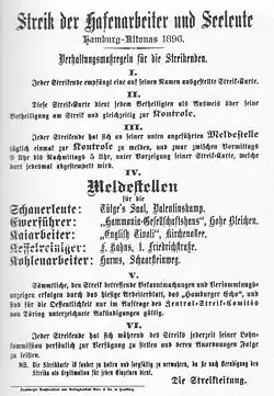 - ^ a b Legien, Carl (1897). Der Streik der Hafenarbeiter und Seeleute in Hamburg-Altona. Darstellung der Ursachen und des Verlaufs des Streiks, sowie der Arbeits- und Lohnverhältnisse der im Hafenverkehr beschäftigten Arbeiter [The strike by dockworkers and seafarers in Hamburg-Altona. Description of the causes and course of the strike, as well as the working and wage conditions of workers employed in port transport.] (in German). Hamburg: Verlag der Generalkommission der Gewerkschaften Deutschlands.