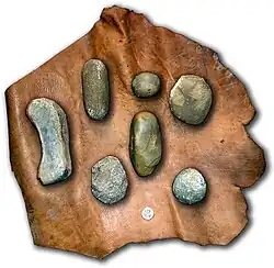 In archaeology, a hammerstone is a hard cobble[1] used to strike off lithic flakes from a lump of tool stone during the process of lithic reduction.[2] The hammerstone is a rather universal stone tool which appeared early in most regions of the world including Europe, India[3] and North America. This technology was of major importance to prehistoric cultures before the development of metalworking.