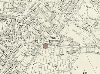 Before construction had begun, an extension was authorised across mostly open countryside to the village of Hampstead.[2] The station was to be located at the junction of Willow Road, Flask Walk and Weatherall Place (now the south end of Well Walk).[3] The extension was authorised in May 1865.[4] The route between Swiss Cottage and Hampstead included an incline of 1 in 27 (3.7%) for which five special engines were constructed by the MR to deal with the steep grade.[5][a]