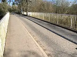 In 1829 the Rvd John Lucy, a member of the affluent Lucy family, paid for the design and construction of the bridge at the east end of Bridge Street.[2] It was designed and cast by Horseley Ironworks and installed by Thomas Townshend, who worked on a number of projects to improve the nearby Birmingham Canal.[3] The bridge consists of four identical cast iron ribs set on ashlared stone piers containing five flood-relief passages apiece in the form of pointed arches.[1][4] It has cast iron handrails flanking a single lane deck with a raised footpath on the northern side.