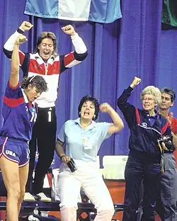 Kathy Callaghan stands on a bench and cheers as she and her teammates learn that they have clinched the gold medal.
