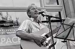 Since 2009 he has been performing on and off at venues around Switzerland as a solo singer and guitarist – and sometimes together with Werner Meier (violin), Jürg Surber (double bass), and Jens Weber (tenor).[47] Under the Robert Burns motto "For A'That", he considers it his mission to keep alive all kinds of political songs (work-songs, revolutionary songs, protest songs, songs of resistance).[48]