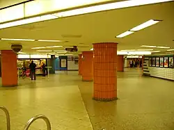 The platform area of the S-Bahn station is also the city's largest fallout shelter. In an emergency, 5,000 people can survive there for two weeks. In adjacent rooms located on several floors there are rooms for serving the shelter, including extensive sanitation facilities and a large kitchen. In addition to the three platforms there is also an area for parking three long trains, which can be used for accommodating the civilian population. In total, 2,300 m2 are available. Since the end of the Cold War the bunker can only be made operational with a lead time of six months.[5][6]