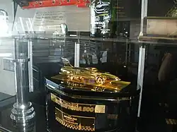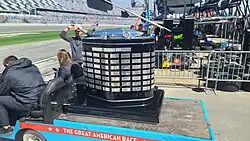 The Harley J. Earl Perpetual Trophy, the "official" version of the award, is housed at the Daytona International Speedway. It stands about four feet (1.2 m) tall, five feet (1.5 m) wide and is in the same triangular "tri-oval" shape of Daytona International Speedway. It's removed from its display once a year to appear in victory lane with the winner of the Daytona 500.[7] In 2010, the trophy was removed from the Daytona International Speedway, transported to the Indianapolis Motor Speedway and put on display alongside the Borg-Warner Trophy – awarded to the winner of the Indianapolis 500 – in the Indianapolis Motor Speedway Hall of Fame Museum during the Indianapolis 500 race week.[8]