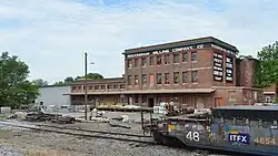 Chesapeake Western Railway Station (1913) is a brick building with two sections, the tow-story front section contains a passenger and office area while the one-story rear section was built for freight. Trim, belt courses, window sills, and lintels on the facade are made of Indiana limestone. The main entrance is ornamented with red-tinted concrete with a crosshatched surface.[3] The building was damaged by fire 1982 and in the 1990's the building was rented out as warehouse space.[3] The building was refurbished as office space and tenants occupied it in July 2016.[4]