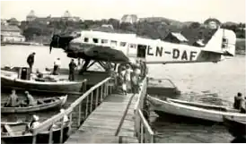 During the German occupation of Norway from 1940 to 1945 the Luftwaffe used the airport for Ju 52 transport seaplanes.[4] DNL resumed flights out of Haugesund on 6 October 1946, this time with two daily round trips. DNL flew until the end of the 1949 summer season using the Ju 52. Widerøe took over the route for the 1950 season, using an eight-passenger Noorduyn Norseman. They failed to get ends to meet and operated only for a single season.[5]