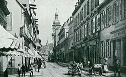 There was a road on the course of the current Hauptstrasse even before the foundation of Heidelberg in 1220, which was used as the central axis of the new city. In 1391, this street was named German: Obere Gasse ("Upper Alley"), in 1491 Latin: platea magna ("Big Street") and in 1508 German: Speierer Straße ("Speyer Street"). It has borne the name German: Hauptstraße, "Main Street" since 1689.[3] City gates stood at the east and west ends of the street. In the east, in the area of the modern Plankengasse, there was the German: Obere Tor ("Upper Gate"), which was replaced by the Karlstor in the 18th century. At the western end of the original city, in the area of the modern Universitätsplatzes, was the German: Niedrige Tor ("Lower Gate") or German: Speyerer Tor ("Speyer Gate"), which was later known as the German: Mitteltor ("Central Gate") and was demolished in 1827. Following the expansion of the city to the west in 1392, the graves outside the gate were dug up and the Hauptstrasse was extended. At the new western edge of the city, in the region of the modern Bismarckplatz, a new gate was built, the German: Äußere Speyerer Tor ("Outer Speyer Gate"), later replaced by the German: Mannheimer Tor ("Mannheim Gate").[3]