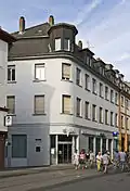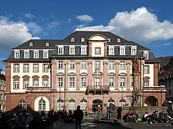 The Hauptstrasse runs right through the Altstadt from Bismarckplatz in the west to the Karlstor in the east, with a slight bend following that of the Neckar river. Between Theaterstrasse and Universitätsplatz, there is a slight rise, which is caused by the alluvial fan of the now subterranean Klingenteichbach stream. The street is around 1.8 km long.[1] It is crossed by numerous streets running from north to south (mostly called Gassen, "alleys") and there are five squares along its route. One of these, the Marktplatz was planned as a market place from the beginning, while the other four - Anatomiegarten, Universitätsplatz, Kornmarkt, Karlsplatz - were created through the demolition of buildings.