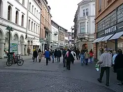 Until its closure to through-traffic in 1969, the Hauptstrasse was an important route for motor traffic and a two-track tram. Since the completion of the conversion in 1978, the whole of the Hauptstrasse except for a short section between Kornmarkt and Karlstor is a pedestrian zone. It is by far the busiest shopping street in Heidelberg and the 43rd busiest in Germany as of 2013, with an average of 5618 people visiting it per hour over the period 2004 to 2013.[6] In addition to the shops and restaurants, there are several significant institutions, like the Town Hall, the Kurpfälzisches Museum, and parts of the University. The Hauptstrasse and the squares along it are often used for events, like the Heidelberger Herbst, the Christmas markets, and the Heidelberg half-marathon.