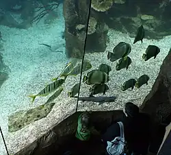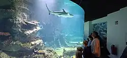 The Haus des Meeres (HdM, English: House of the Sea) is a public aquarium in Vienna, Austria. It is located in Esterhazy Park in the centre of Mariahilf district, one block south of the busy Mariahilfer Straße. The Haus des Meeres houses over ten thousand aquatic beings on an area of around 4,000 square meters (43,000 sq ft) inside a tall concrete flak tower built during World War II.[3] In 2012 the Haus des Meeres attracted a record high of 650,000 visitors.[2] The Haus des Meeres is managed by Aqua Terra Zoo, a private non-profit organization which, according to its web site, receives only marginal financial support from municipal authorities.[note 1] However, the maintenance costs for the former flak tower are paid by the taxpayer.