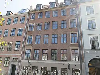 Christian Offer Frydensberg worked as a senior clerk (fuldmægtig) for Copenhagen County at the time of the 1840 census. His property was then home to 32 residents in five households. Christian Offer Frydensberg resided on the third floor with his wife Gudrun (née Petersen), their two children (aged one and five), two lodgers, a maid and a wet nurse.[3] Jørgen Christian Hansen, an actor at the Royal Danish Theatre, resided on the second floor with his wife Adolphine Erhardine Hansen, their one-year-old sonCarl Christian Hansen, a still unnamed infant daughter, a housekeeper (husjomfru), a maid and a wet nurse.[4] Jens Hansen Lund, a silk and textile merchant, resided on the first floor with one maid.[5] Jens Nielsen Larsen, a sculptor, resided on the ground floor with his wife Louise Augusta Holtem their six children (aged one to 11) and one maid.[6] Frederikke Conradine Elise Bruun, who ran a scuool (probably in her home), resided on the fourth floor with the teacher Julie Worishøffer.[7] Johan Christian Steinhäuser, a building painter, resided in the garret with his wife Sophie Amalie Steinhäuser and their two children (aged one and four).[8]