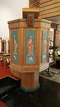 Like most other churches in Finnmark, Havøysund church was burned down by the Germans during the evacuation of Finnmark in 1944. The new church was built of whitewashed concrete and dark wooden timbers in a long church style in 1960 using plans drawn up by the architect Esben Poulsson. The altarpiece and pulpit decoration were painted by the artist Terje Grøstad. The church seats about 300 people.[2][3][4]