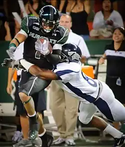The Hawaii Rainbow Warriors football statistical leaders are individual statistical leaders of the Hawaii Rainbow Warriors football program in various categories,[1] including passing, rushing, receiving, total offense, defensive stats, and kicking. Within those areas, the lists identify single-game, Single season and career leaders. The Rainbow Warriors represent the University of Hawaii at Manoa in the NCAA's Mountain West Conference (MW).