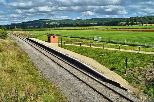 Although a new halt was planned on the site in 1998,[18] this did not materialise. In March 2015, it was reported that the board of the GWSR had authorised the reconstruction of the station to a design to match the original.[19] However, unlike the original, only a single two-coach platform will be provided on the Cotswolds side of the line.[19] In June 2016, it was confirmed that a corrugated iron shelter, recovered from Usk and similar to the one originally at Hayles Abbey Station, would be erected.[20]
