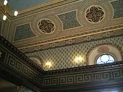 In 1870 construction of new synagogue, with the backing of the aristocratic landowner, on the same site as the 1760 building was started. This building was in the Neo-Romanesque style by the architect František Schmoranz. The architect had some lofty plans which had to be abandoned because the Catholic clergy feared that the synagogue might outshine the nearby Church of St. Bartholomew. The original design had a tower with a stairway leading to the women's gallery. After design changes, the synagogue provided access to the women's gallery via a covered passageway from the school building next door. A stone-hewn image of the Ten Commandants adorned the top of the building. Due to the reduction in size, the building was not really sufficient to support the large crowds which attended worship services especially on holidays. As the Jewish population declined toward the latter part of the 19th century, the building became sufficient.[4]