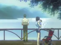Kozo Fuyutsuki and Yui Ikari with young Shinji discussing on Dead Sea Scrolls scenario. The scene comes from the extended (director's cut) home video version. Mechademia Mariana Ortega described Yui playing with Shinji as a "benign Madonna".