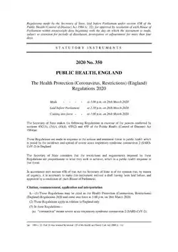 SI 2020/350 gave legal force to some of the 'lockdown' rules that had been announced by the Prime Minister Boris Johnson during a televised address on 23 March 2020.[1] The SI related to England only; there were separate regulations for Wales,[2] Scotland[3] and Northern Ireland.[4]
