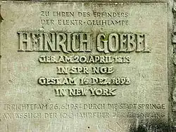 Monument from 1954 in honor of Göbel as the "inventor of the electric light bulb". The date of death in the monument inscription is December 16, 1893; The Electrical World reported the death of Göbel on December 4th in the issue of December 16th. In Germany the date of issue was erroneously reported as the date of his death in a significant 1923 article about Göbel, which is the reason for the incorrect date of death in the monument inscription.