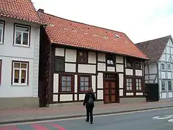 House that was believed to be Göbel's birthplace. However, while he lived in this house in the 1840s, it is not his birthplace. At the front side of this house an incandescent light bulb is lit day and night.[1]: 96