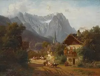 He set off again in 1851, travelling through Dresden, Prague and Linz, to Styria, where he planned to become a landscape painter. This time, he was more successful. By 1855, he could afford to settle in Munich and join the Kunstverein (Artists' Association). There, he soon learned that being self-taught was not enough. Through some friends he was introduced to Eduard Schleich, who assisted him, and he was able to make copies of the old Dutch Masters at the Alte Pinakothek.[1] He also decided to make a systematic study of nature, and made several painting expeditions every year, that took him throughout Bavaria, Tyrolia, and Switzerland. The Chiemsee and the Fraueninsel were among his favorite locations.[2]