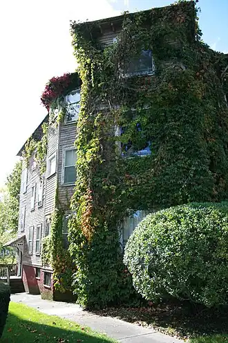 The Helen Dodge Three-Decker is located in a residential setting west of downtown Worcester, on the south side of Pleasant Street opposite the city's Newton Hill Park. It is a three-story wood-frame structure, with a gable-on-hip roof and a mostly clapboarded exterior. Prominent features of its front facade include an angled projecting rectangular bay on the left side, and a stack of three porches on the right. The porch is distinctive for its semi-circular arch openings, and there are bands of decoratively cut shingles between the floors.[2]