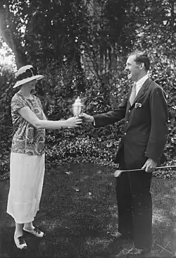 Duchess Decazes gives the cup to the Duke of Mouchy (Henri de Noailles - 1890-1947 -), golf winner (in Deauville) - (press photography) - (Agence Rol)
