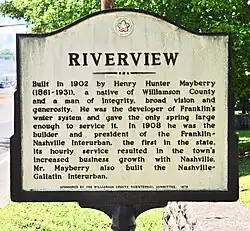 The Henry H. Mayberry House, also known as "Riverview", is a private home in Franklin, Tennessee located on Franklin Pike (US 31) just north of the Harpeth River Bridge. Built in 1902 in Neo-Classical or Classical Revival architecture, it is one of the notable residences of the 1900-1935 period in Williamson County.[a] At the time it was built it had the most technologically advanced utilities in the county, including electric lights and its own water works. It was listed on the National Register of Historic Places in 1988. When listed, the property included an area of 26 acres (11 ha).[3]