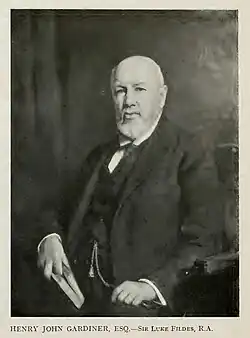 Although he took no part in the public life of the City of London, Gardiner was elected Sheriff of the County of London for 1919–1920.[8][35] Sir Luke Fildes painted a portrait of him, entitled 'Henry John Gardiner, Esq.' (see top of article).[36]