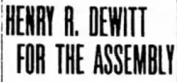 9. ^ "Henry R. DeWitt for the Assembly". The Kingston Daily Freeman. October 13, 1915. Retrieved 18 June 2018.