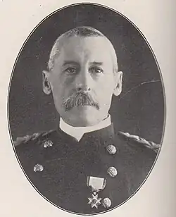 On August 16, 1892, he was promoted to major and would be the commander of the regiment during the Spanish–American War, commanding the regiment during the Battle of San Juan Hill but was wounded during the battle.[7] He was subsequently promoted to colonel on May 2, 1899, colonel of the 2nd Cavalry Regiment in February 1901. He briefly participated in the Philippine–American War but was discharged from service there due to poor health on February 2. He continued to remain in the United States Army and was promoted to brigadier general before retiring on April 23, 1904.[8] He died on November 9, 1929, and was buried at the Arlington National Cemetery along with his wife, Eliza Lane Wessells (née Meginnis).[3]