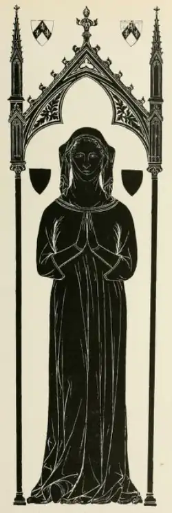 A monumental brass, laid down in 1320, survives in St Mary Magdalene's Church, Cobham, of Joan Septvans (d. 1298), wife of John de Cobham (d. 1300) and mother of Henry de Cobham, 1st Baron Cobham. It displays one of the earliest-known specimens of a Gothic canopy.[3] The inscription, in Longobardic letters and Leonine verse is as follows: