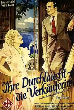 Her Highness the Saleswoman (German: Ihre Durchlaucht, die Verkäuferin) is a 1933 German comedy film directed by Karl Hartl and starring Liane Haid, Willi Forst and Paul Kemp.[1][2] The film is based on the play My Sister and I by Georges Berr and Louis Verneuil. It was shot at the Babelsberg Studios in Potsdam. Location shooting took place around Lake Constance and Lindau in Bavaria.[3] The film's sets were designed by the art director Werner Schlichting. It premiered in Hamburg and first appeared in Berlin at the city's Gloria-Palast.[4] A separate French-language version The Princess's Whim was also produced.