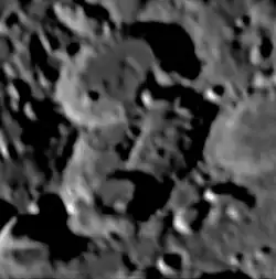 Heraclitus is a complex lunar impact crater that lies in the rugged southern highlands of the Moon. The crater Licetus forms the northern end of the formation. Just to the east is Cuvier, and due south is Lilius. Just to the west of Heraclitus is the small satellite crater Heraclitus K, to the south of which is a pair of larger overlapping craters, Lilius E and Lilius D.[1]