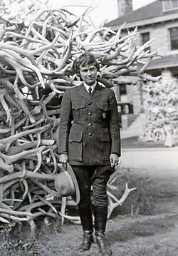 In 1921, she enrolled at the University of Idaho, where she majored in botany and minored in philosophy.[3] She returned to teaching for the 1922 to 1923 school year, but afterward resumed her studies and was elected to the Phi Beta Kappa and Sigma Xi honor societies.[2] She then worked as a schoolteacher for a few years before returning to the University of Idaho for her master's degree.[4] She graduated in 1929 and became an instructor at the University of Idaho.[3] Over the next two summers, she worked as a seasonal employee at Old Faithful at Yellowstone National Park in 1929 and 1930, helping design the first trail to Old Faithful.[4][3] She regularly delivered guided talks and lectures, sometimes drawing crowds of hundreds.[2] In 1931, she was hired by the National Park Service as a full-time naturalist at Yellowstone, the first woman to hold the role.[5]