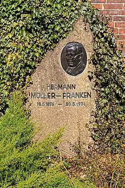 After resigning as chancellor, Müller retired from public life. Following the elections in September 1930, which saw massive gains for Adolf Hitler's NSDAP, Müller called on his party to support Heinrich Brüning's government even without being part of the coalition.[1] His death in 1931 following a gallbladder operation[2] was seen as a major blow to the Social Democrats. He died in Berlin and is buried there at the Zentralfriedhof Friedrichsfelde.
