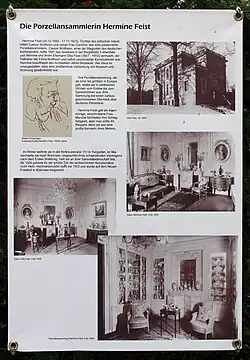 Hermine Feist and her husband inherited the property and the villa at Bergstrasse 5[2] in the Colonie Alsen on the Großer Wannsee in Berlin from her father.[4] Hermine Feist commissioned the architect Alfred Breslauer to redesign the villa so that it could be used both for residential purposes and for the museum presentation of the collection.[4] Hermine Feist's porcelain collection was considered to be one of the largest in Europe and offered an almost complete ovelrview of German porcelain. The collection included figurines, vases and tableware from the Meissen, Höchst, Frankenthal, Nymphenburg, Vienna, Ludwigsburg, Fulda and Limbach manufactories.[2] She also collected old lace and jewelry. Together with her husband, she also acquired a collection of paintings that included works by Joshua Reynolds, Jean-Baptiste Pater, Reinhold Lepsius, Joseph Highmore, Franz von Lenbach and Francisco de Goya.[2]